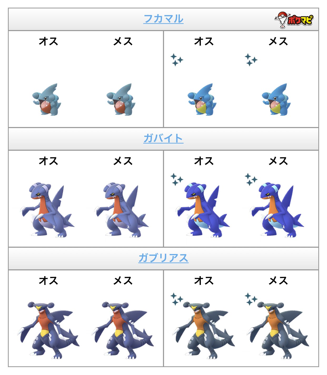 野生での色違い遭遇確率は 02% となるため、運の良さもなければ色違い入手は非常に難しいです。 進化先となる「ガバイト」「ガブリアス」の色違いを入手するためには、「フカマル」の色違いを進化させる必要があります。 色違い情報まとめかっくんの色違い ポケモン 16年8月からポケモンの色粘りに熱中しておりますかっくんと申します! 少しずつ捕まえた色違いポケモンを紹介していきたいと思ってます^_^ 気軽にコメントなどよろしくお願い致します!
